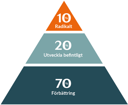 Utgångspunkten är att ha en väl avvägd balans mellan ständiga förbättringar, utvecklingsprojekt inom verksamhetsplanen och radikala innovationer. Forskningen visar att man över tid bör lägga 70% av utvecklingsmedel på förbättringar, 20% på utvecklingsprojekt och 10% på radikal innovation, som vanligen ger resultat på längre sikt och säkrar verksamhetens långsiktiga överlevnad.